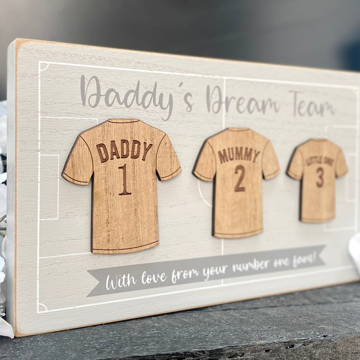 Show your Dad who his number one fans are with our gorgeous wooden "Daddy's Dream Team" block sign. In an interior-friendly grey wash, the plaque features three wooden 3D football shirts with debossed wording that reads "Daddy 1", "Mummy 2", and "Little One 3". With a rustic finish, it will make the perfect feature on his desk and remind him just how loved he is!